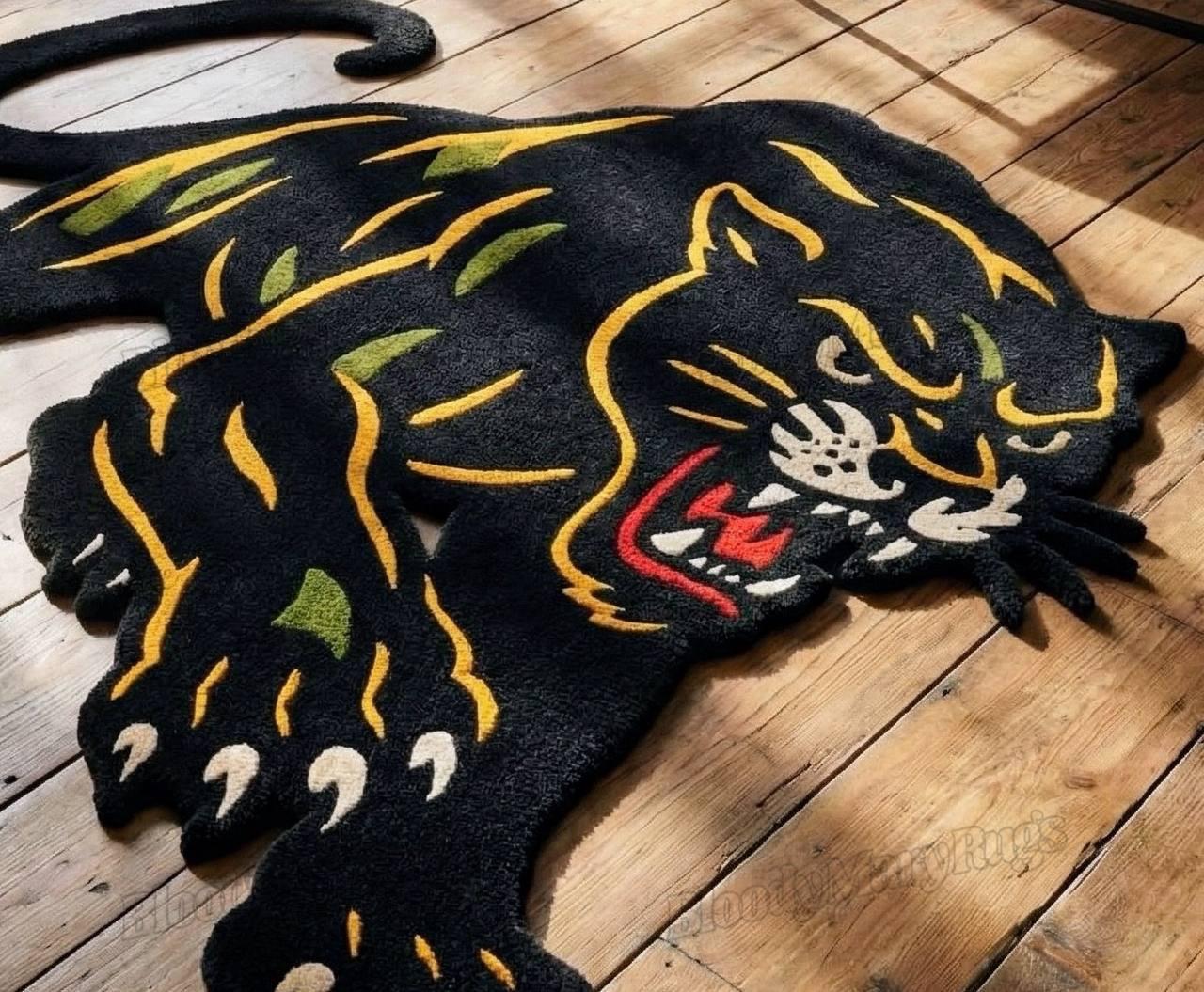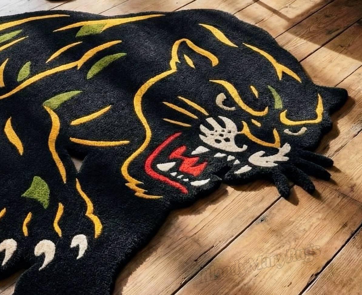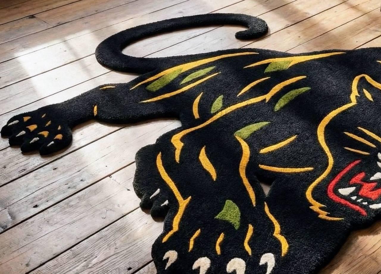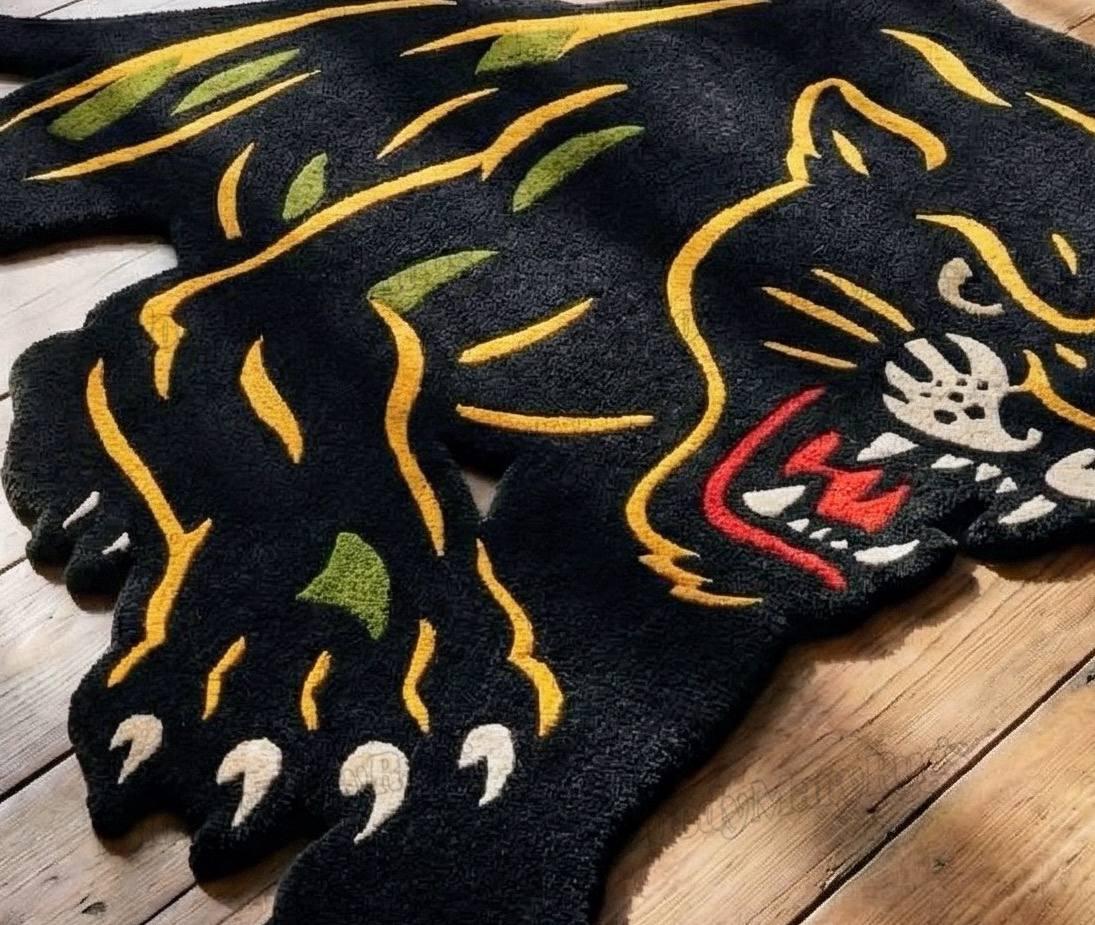 This is not a printed or machine-made rug; it is an heirloom-grade hand-knotted piece, made to last for decades while maintaining its bold character. The aggressive panther silhouette, vibrant tattoo-inspired detailing, and sculpted edges make it one of the most unique statement rugs available today.