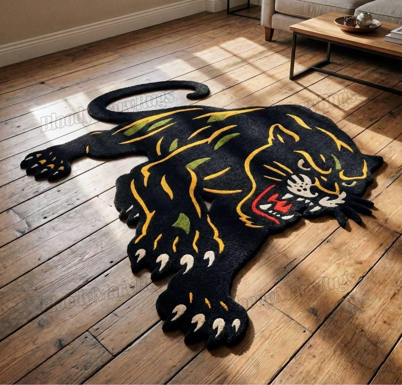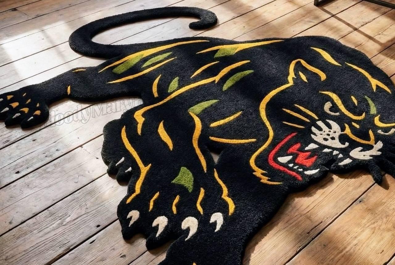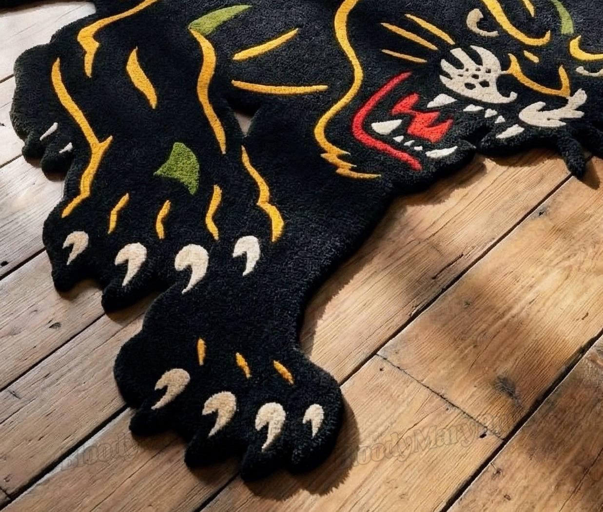 This is not a printed or machine-made rug; it is an heirloom-grade hand-knotted piece, made to last for decades while maintaining its bold character. The aggressive panther silhouette, vibrant tattoo-inspired detailing, and sculpted edges make it one of the most unique statement rugs available today.