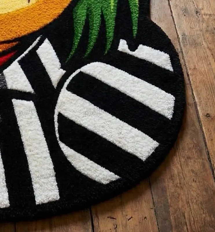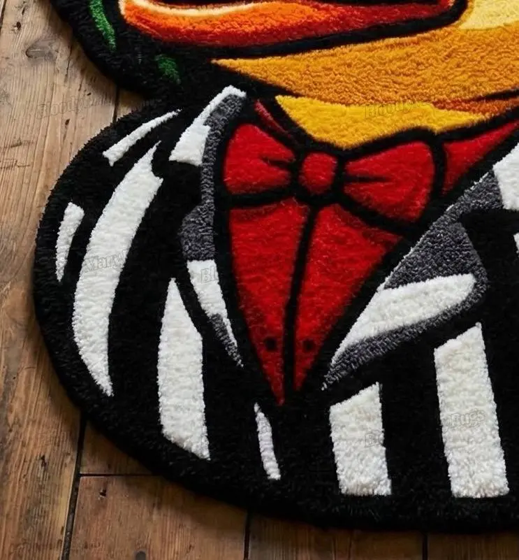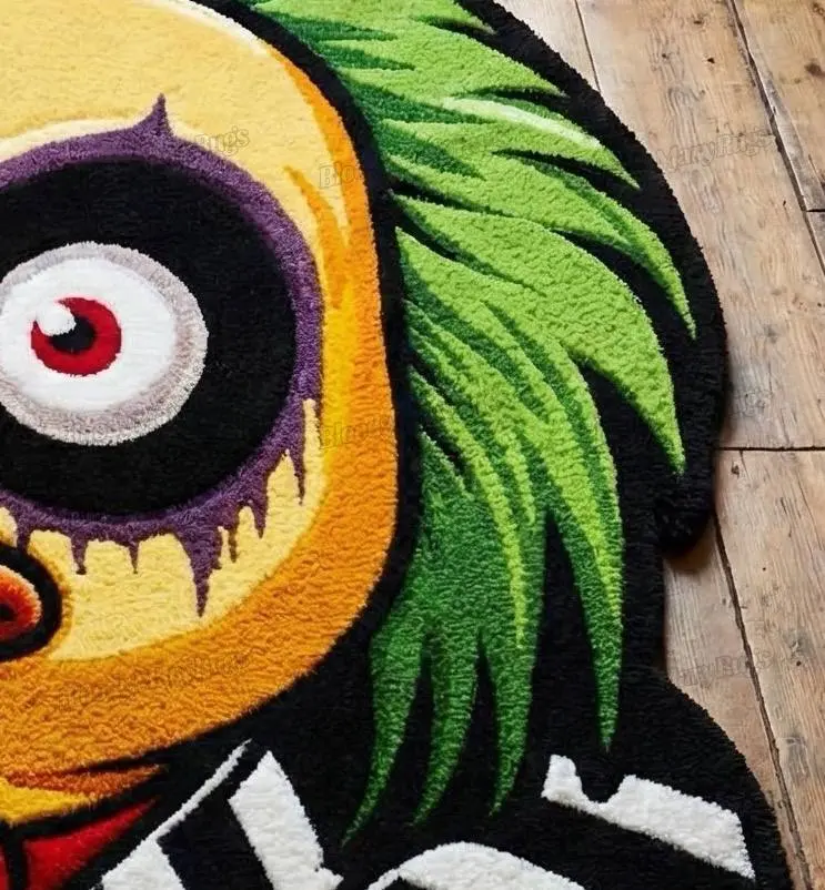 Cut to a custom silhouette that follows every curve of the head, beak and shoulders, this rug feels like a character dropped into your living room, not just a rectangle on the floor. Rich yellow, orange and neon green tones glow against the black and white stripes, while purple under‑eye shadows add that deliciously unhinged energy that makes guests stop and stare.