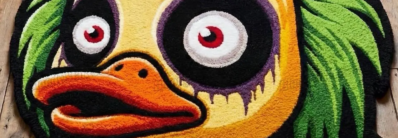 This hand tufted Beetle Duck rug from BloodyMaryRugs® walks straight out of a cult movie and lands on your floor. The oversized yellow duck face, wild green hair and hypnotic red‑ringed eyes sit inside a sharp black outline, with the striped monochrome suit tying it all together like a piece of street‑pop art you can actually stand on.
