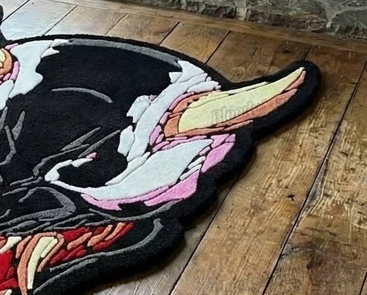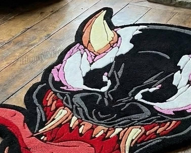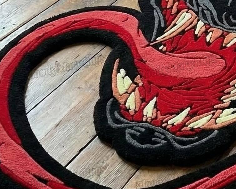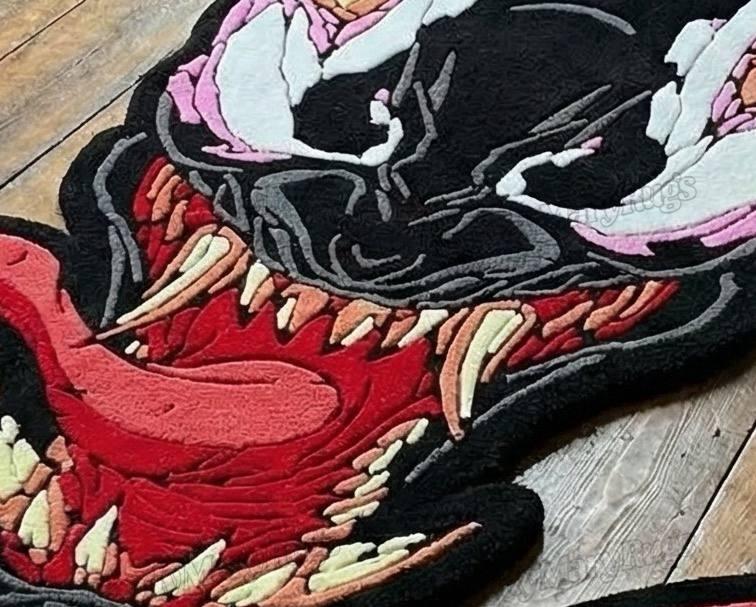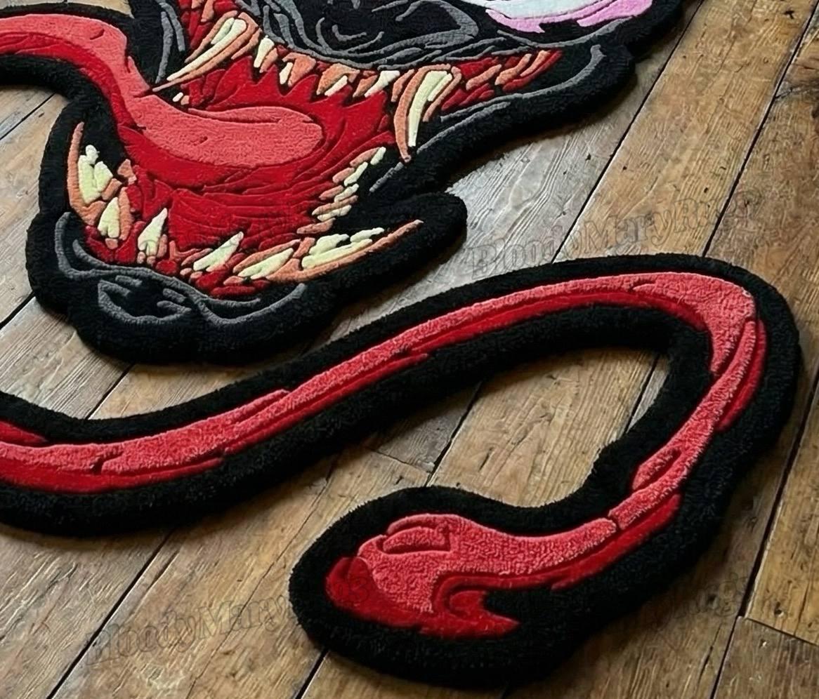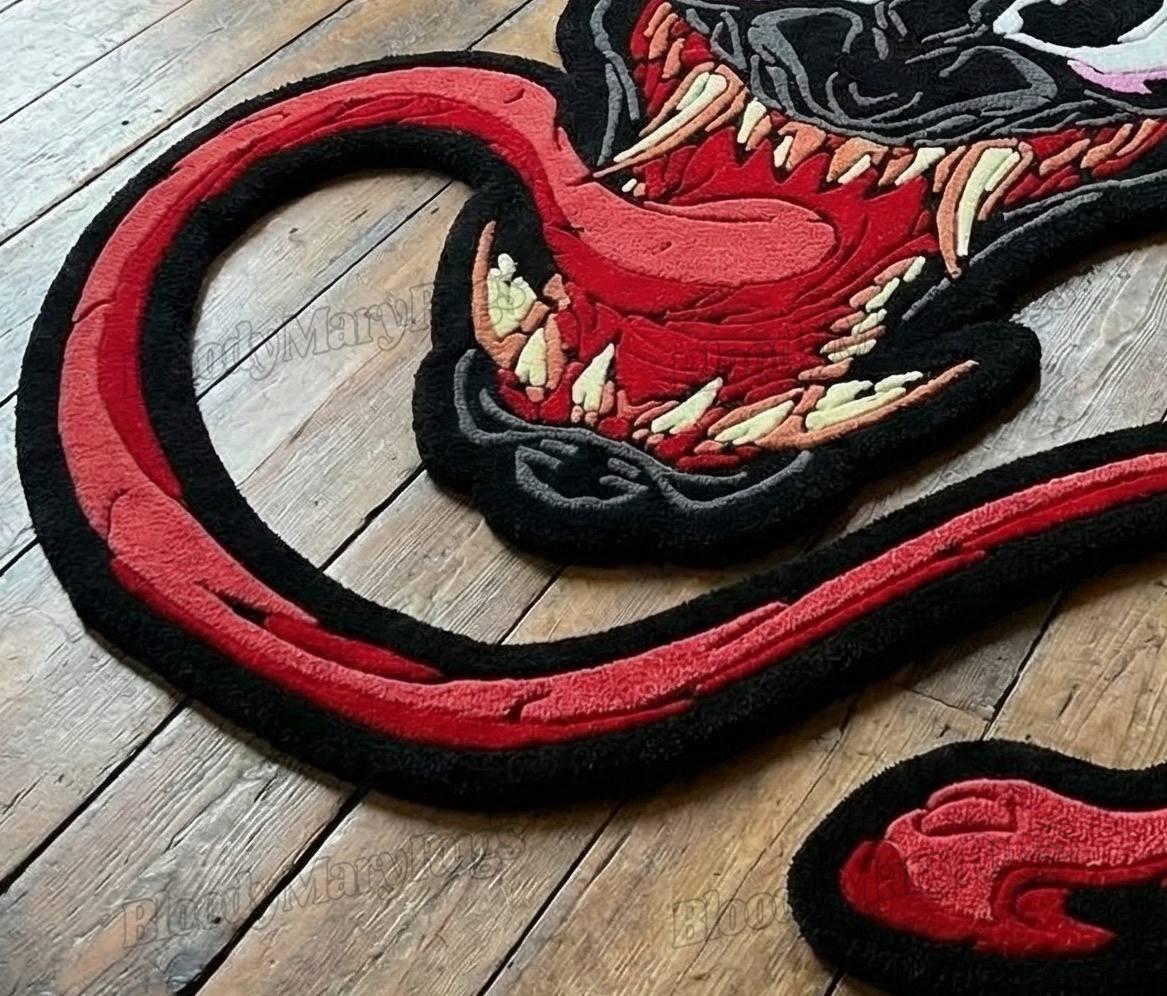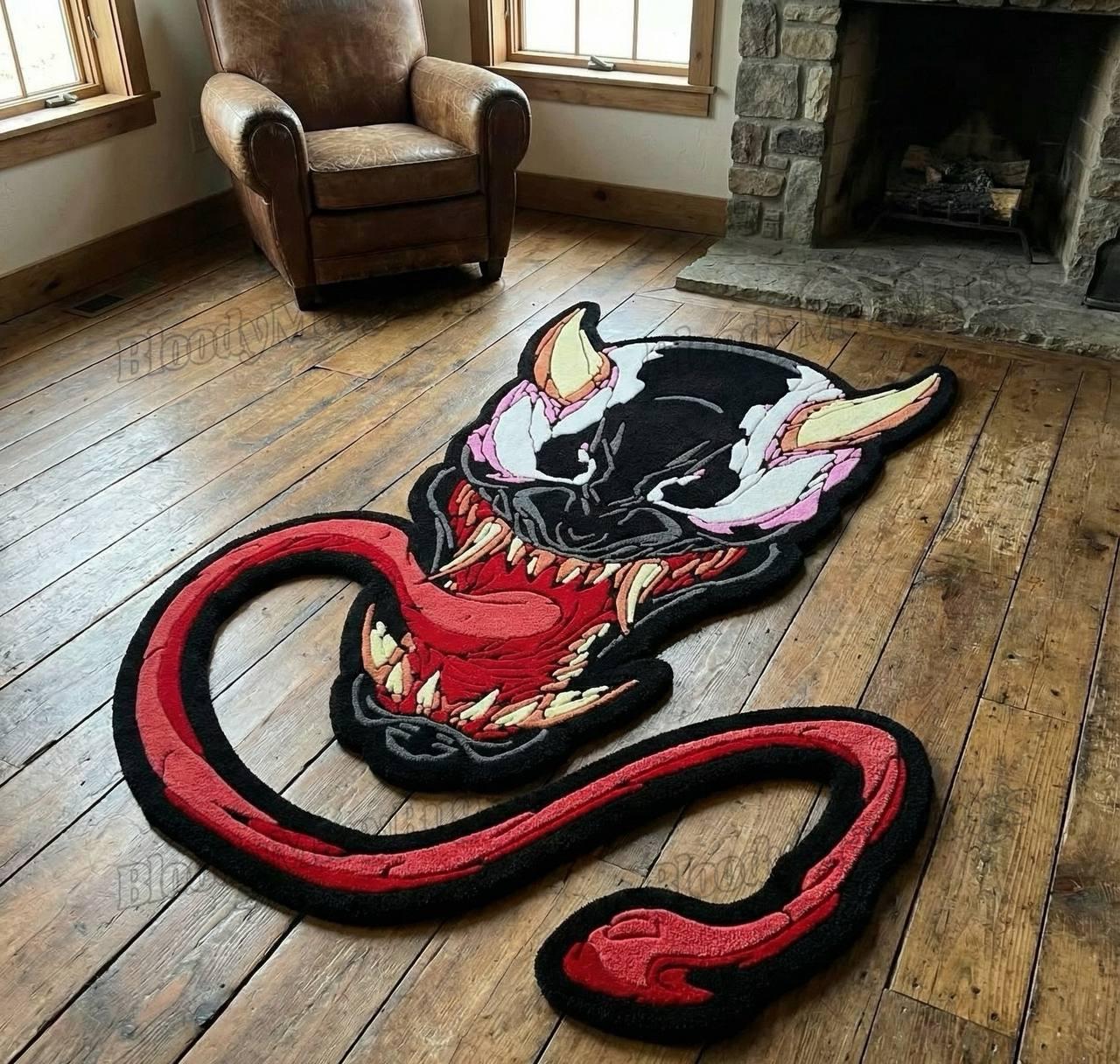 With its sharp teeth, bright red mouth, and long, curved tongue section that makes a crazy visual path across wooden or contemporary floors, this venom tongue monster rug is designed to dominate the space.
