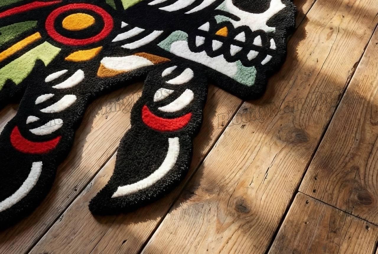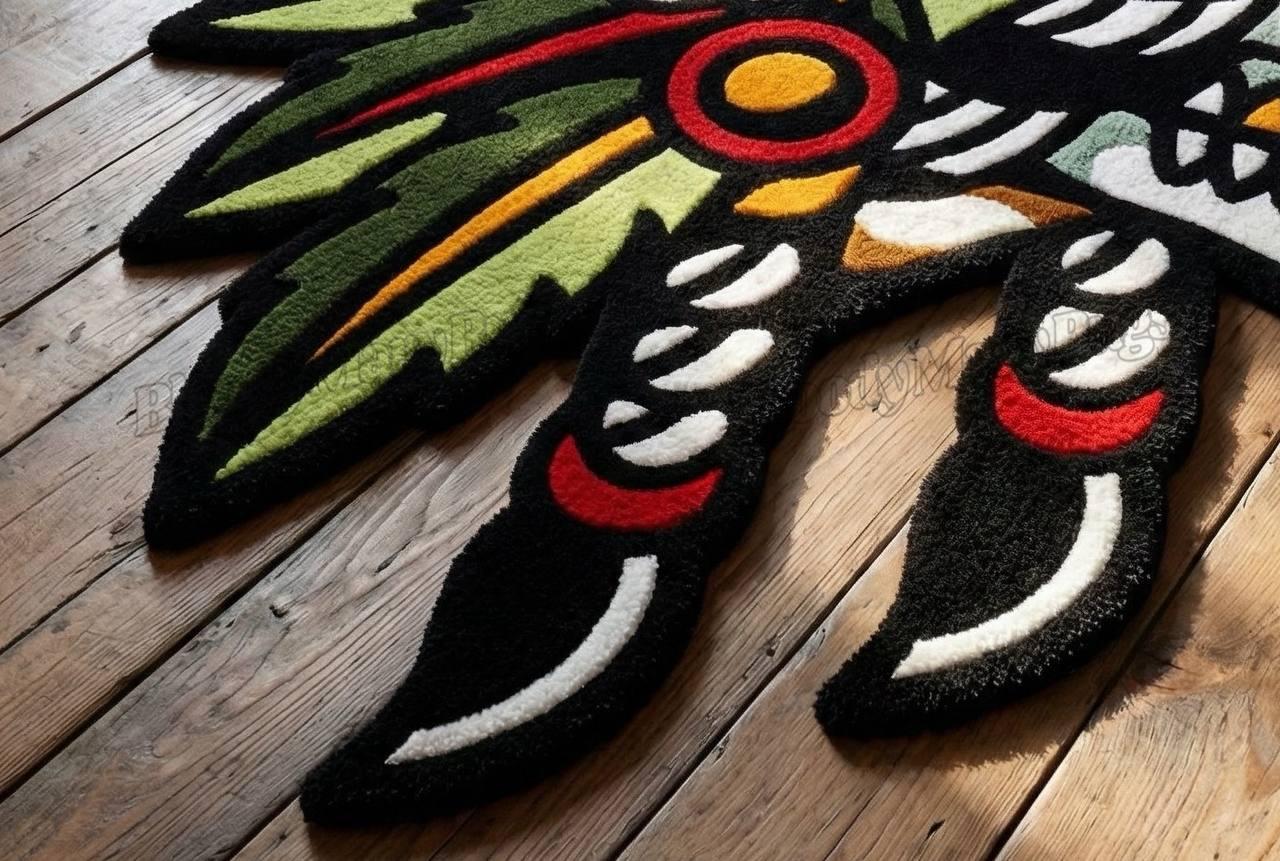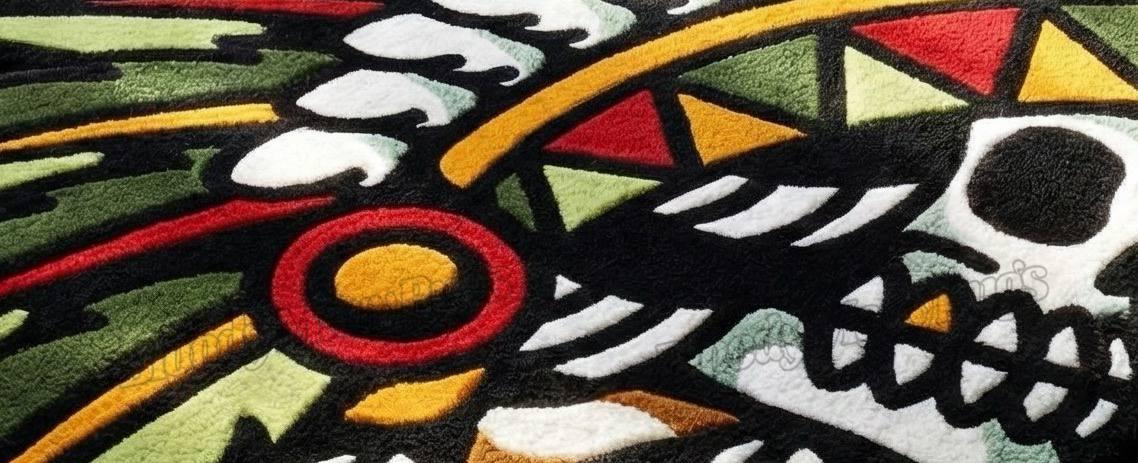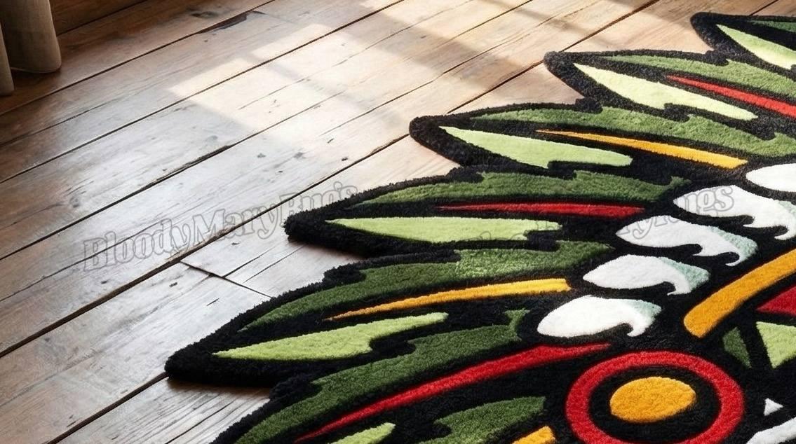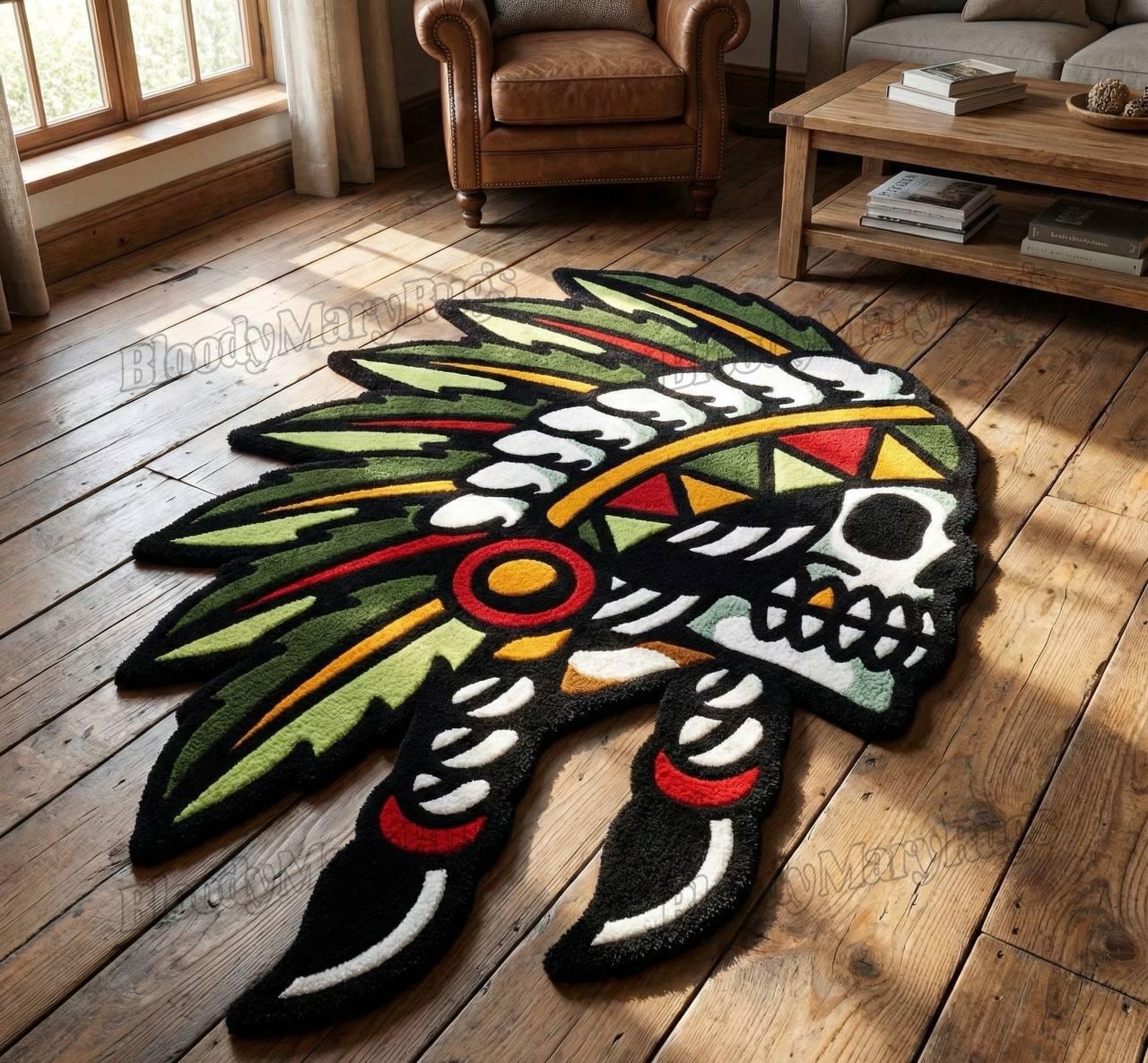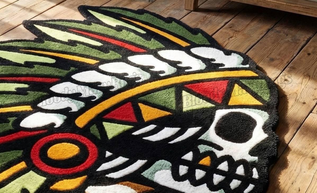 Bloody Mary Rugs A striking accent for living rooms, studios, or gaming areas, this hand-tufted rug depicts a tribal skull chief with a vibrant feathered headdress.