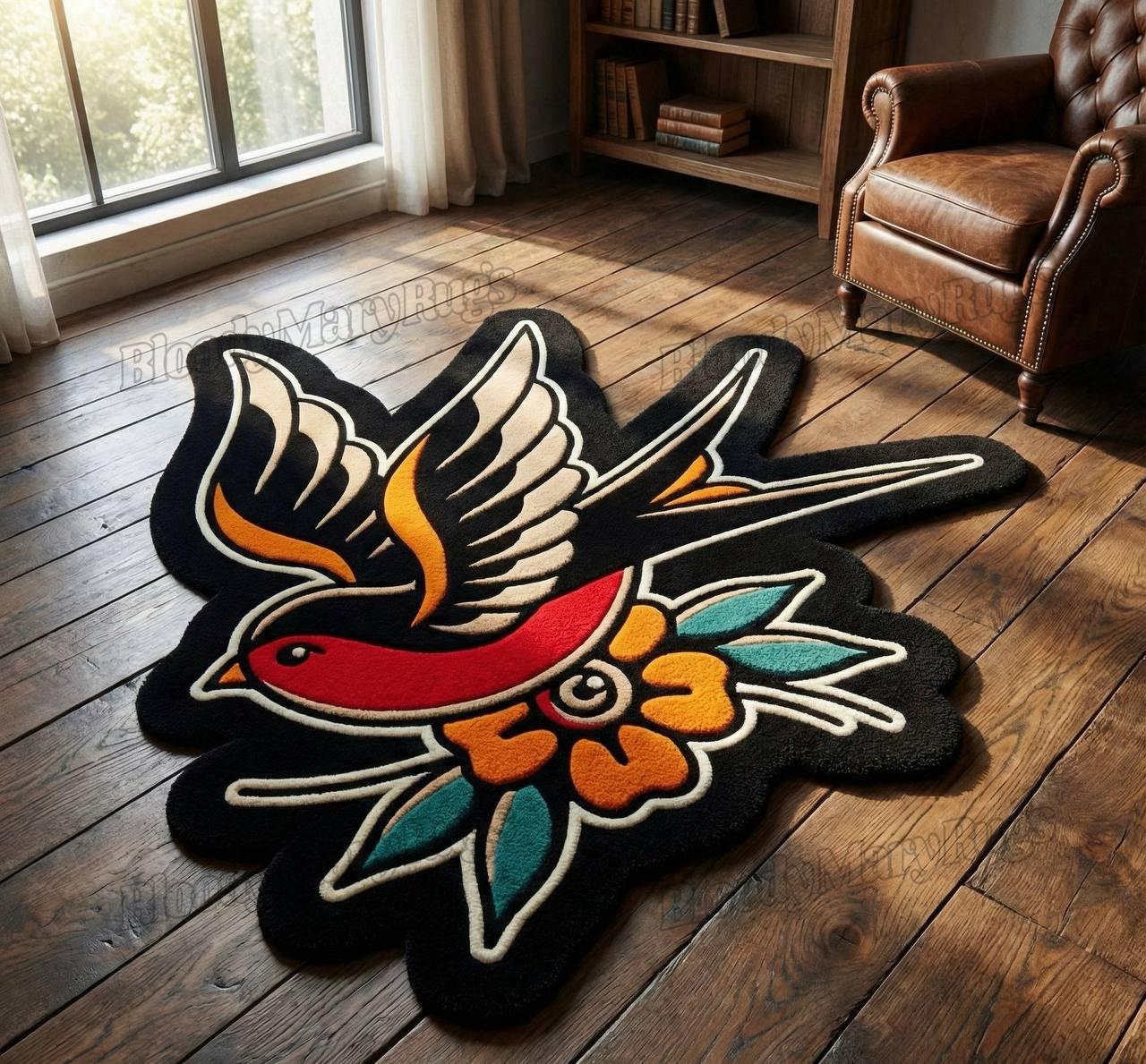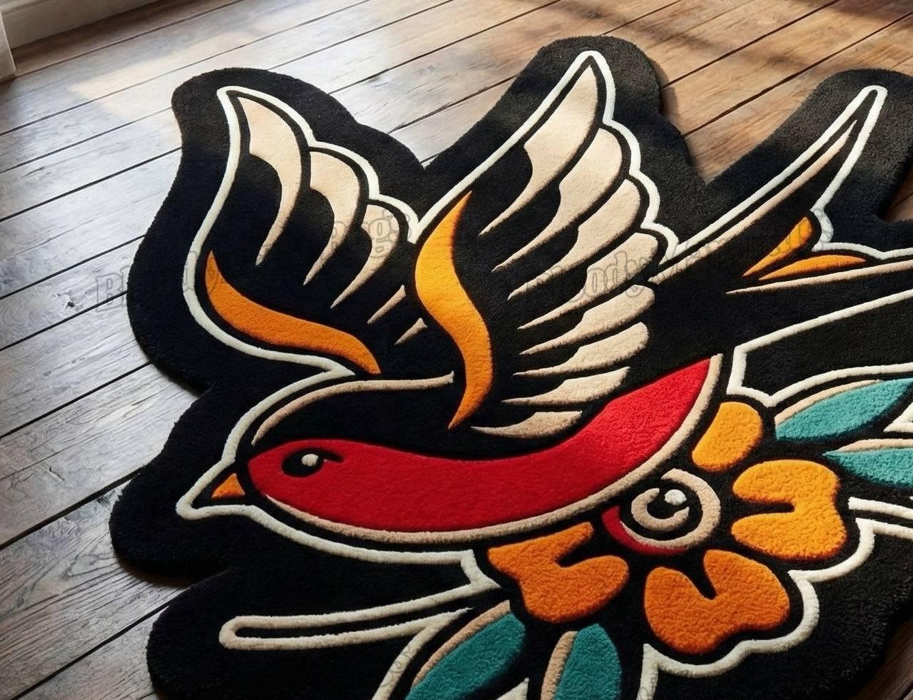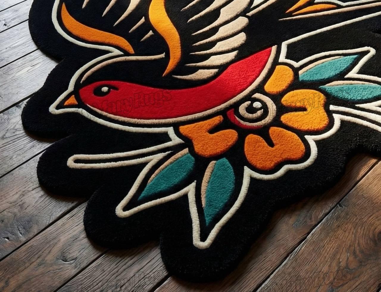 The Flying Sparrow Rug is a bold handmade tufted carpet with a striking bird-and-flower design that will make your space come to life. Extremely soft, long-lasting, resistant to fading, and ideal for modern interiors, studios, and bedrooms.