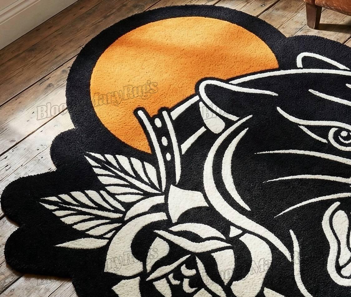 Inspired by neo-traditional tattoo culture, the rug features a ferocious panther mid-snarl, framed by crisp white roses and leaves, all backlit by a bold burnt-orange sun rising behind its head. Every curve, every line, every detail is cut by hand and tufted with dense, luxurious fibers that give the design a rich, almost sculpted appearance.