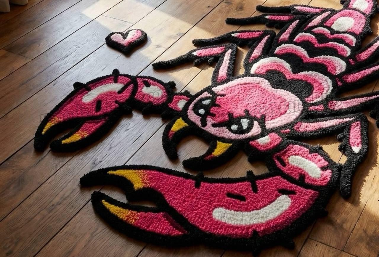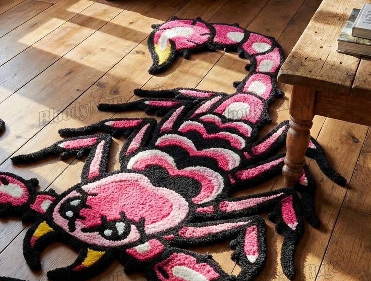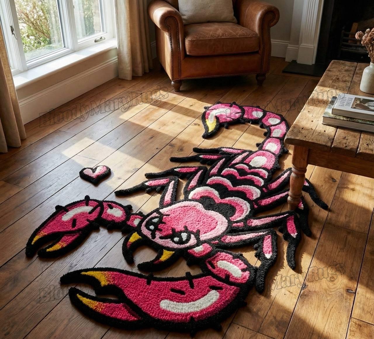 Layered pink tones, striking black outlines, and an eye-catching playful heart detail characterize this pink scorpion rug. The tufted pile is soft underfoot, and its asymmetrical scorpion shape makes it a striking focal point on modern or wooden floors. It is also easy to maintain with basic spot cleaning and vacuuming.