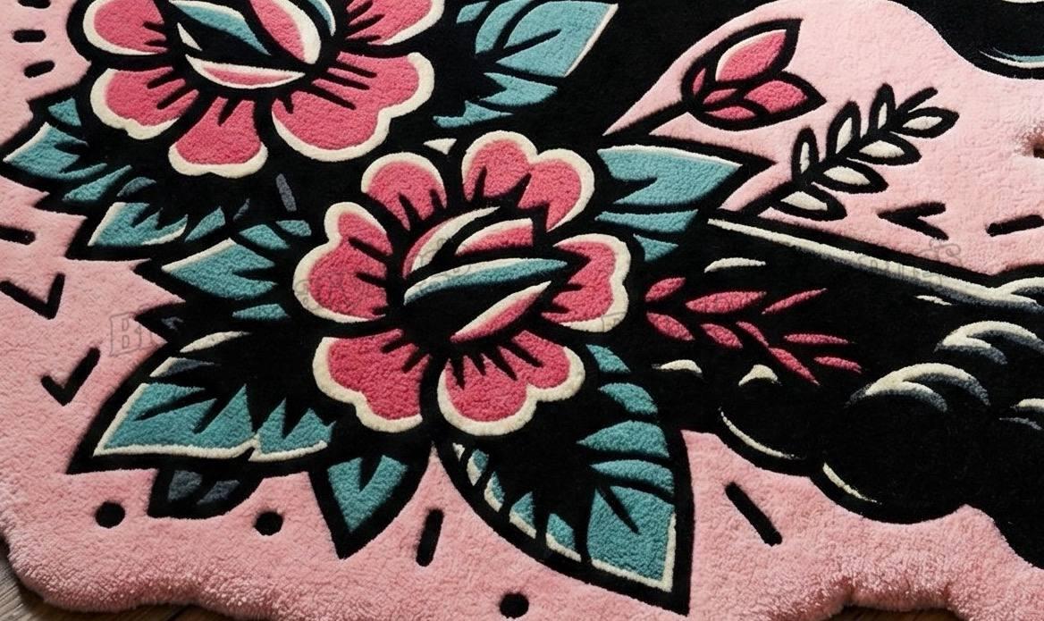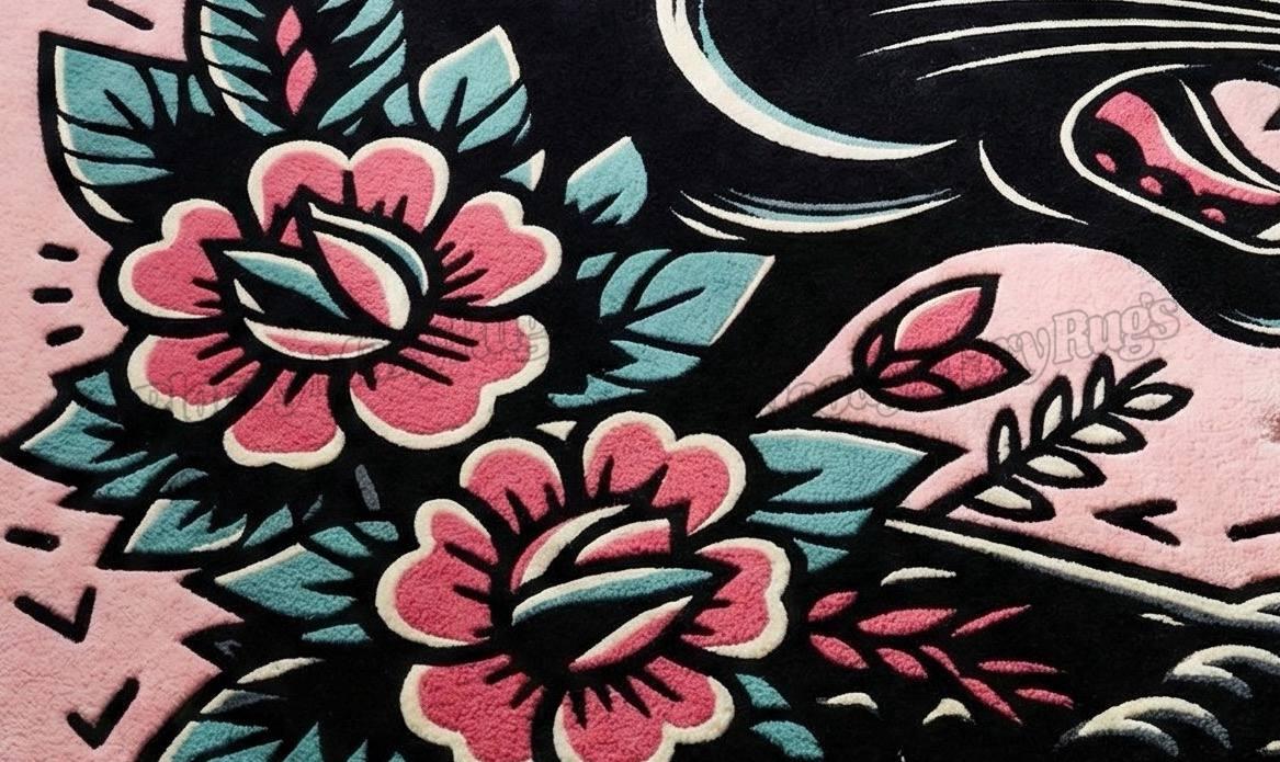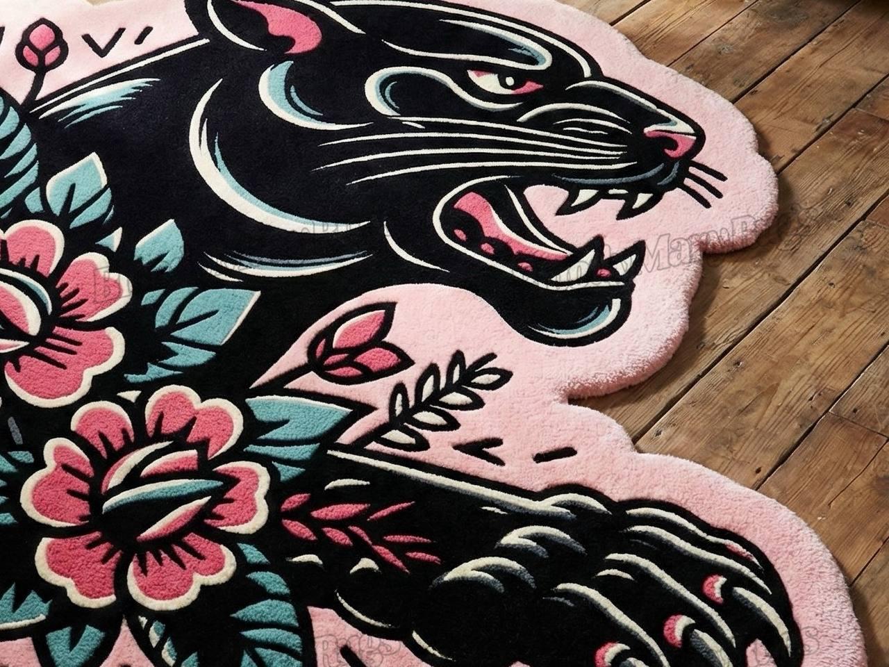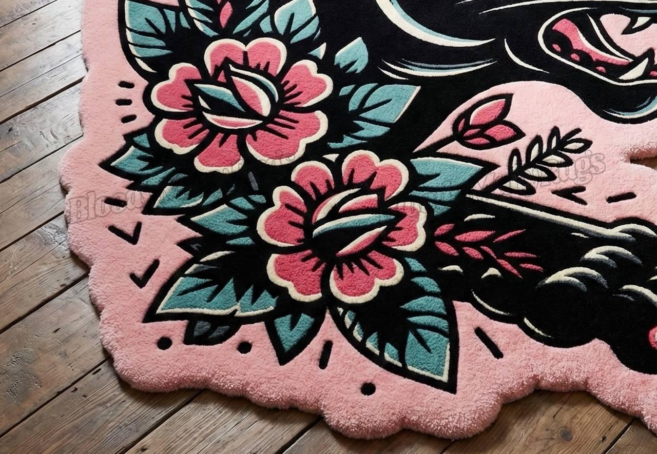 Introducing the Hand-Tufted Pink Panther Tattoo Rug, a fierce, floral, retro-inspired statement piece that refuses to be ignored. Wrapped in a dreamy pastel-pink outline with a snarling black panther bursting through bold teal-and-rose blossoms, this rug is equal parts attitude and artistry.