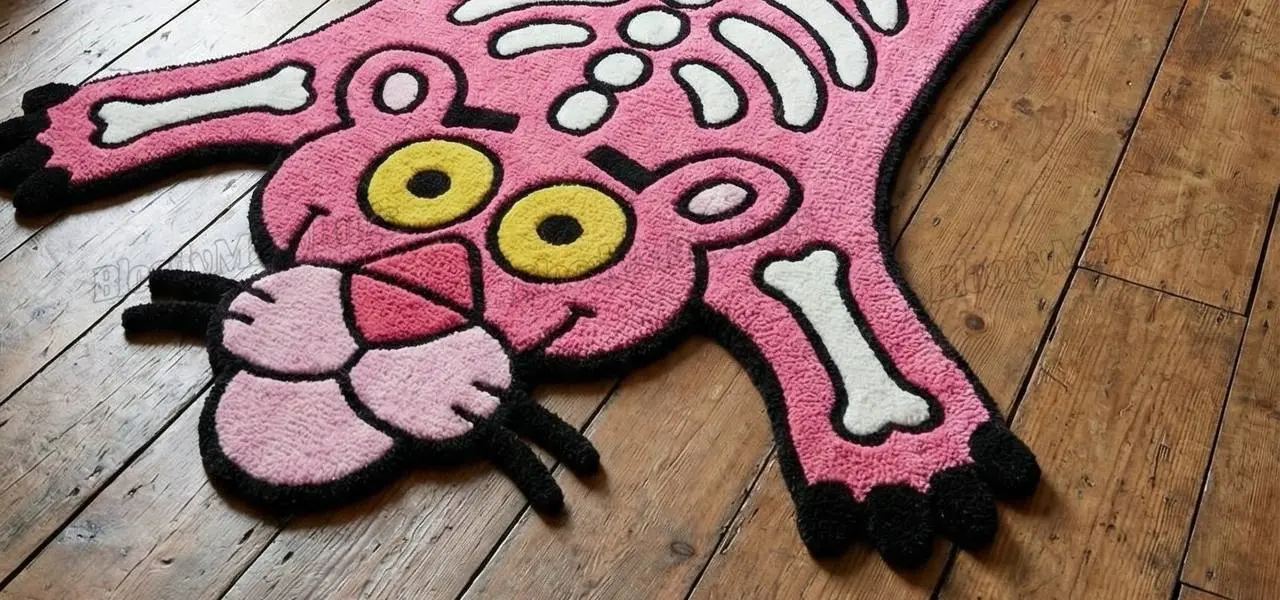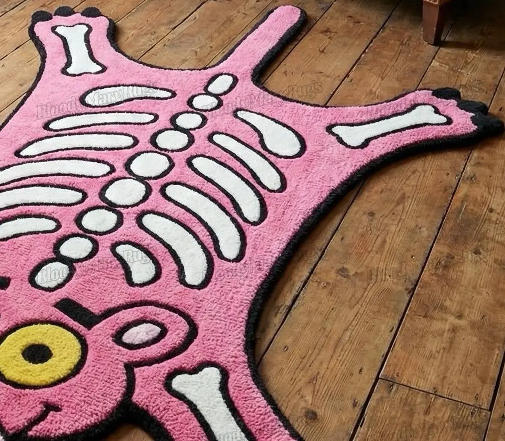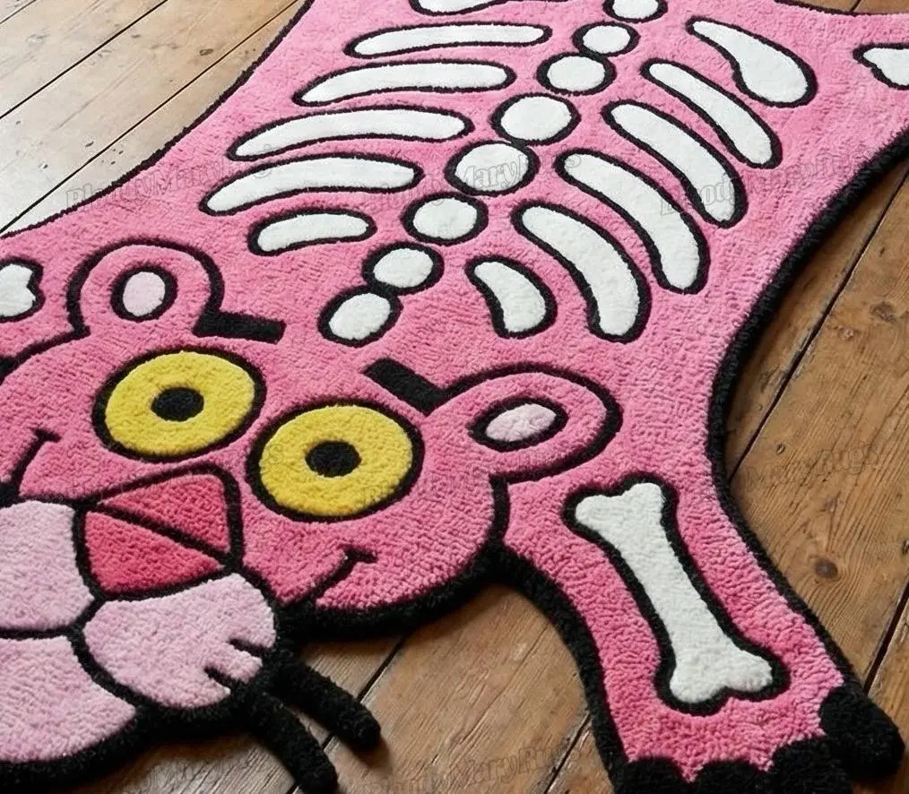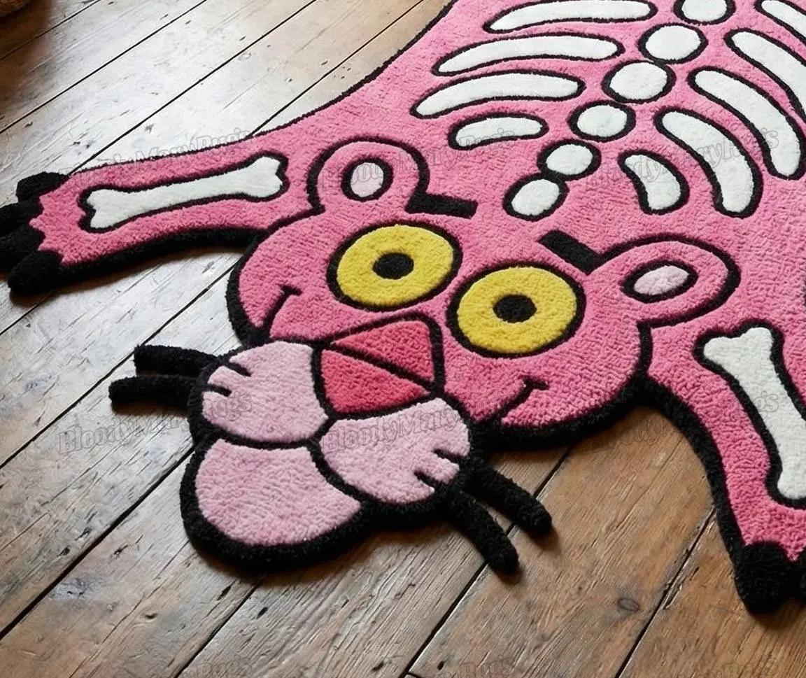 A bright pink panther stretches across your floor, bones glowing white, eyes wide and playful. This hand tufted rug turns a calm room into a little bit of cartoon chaos in the best way.