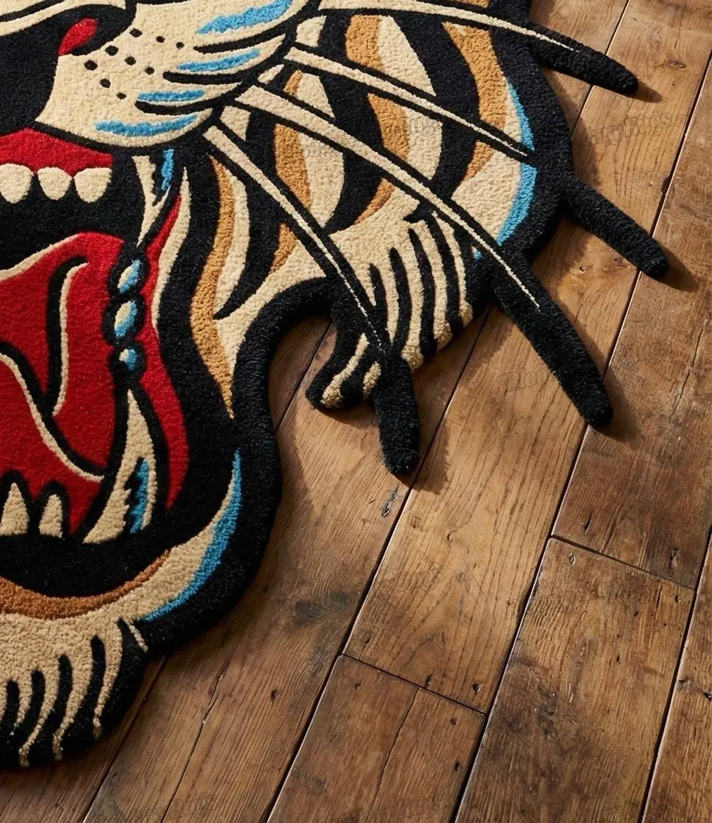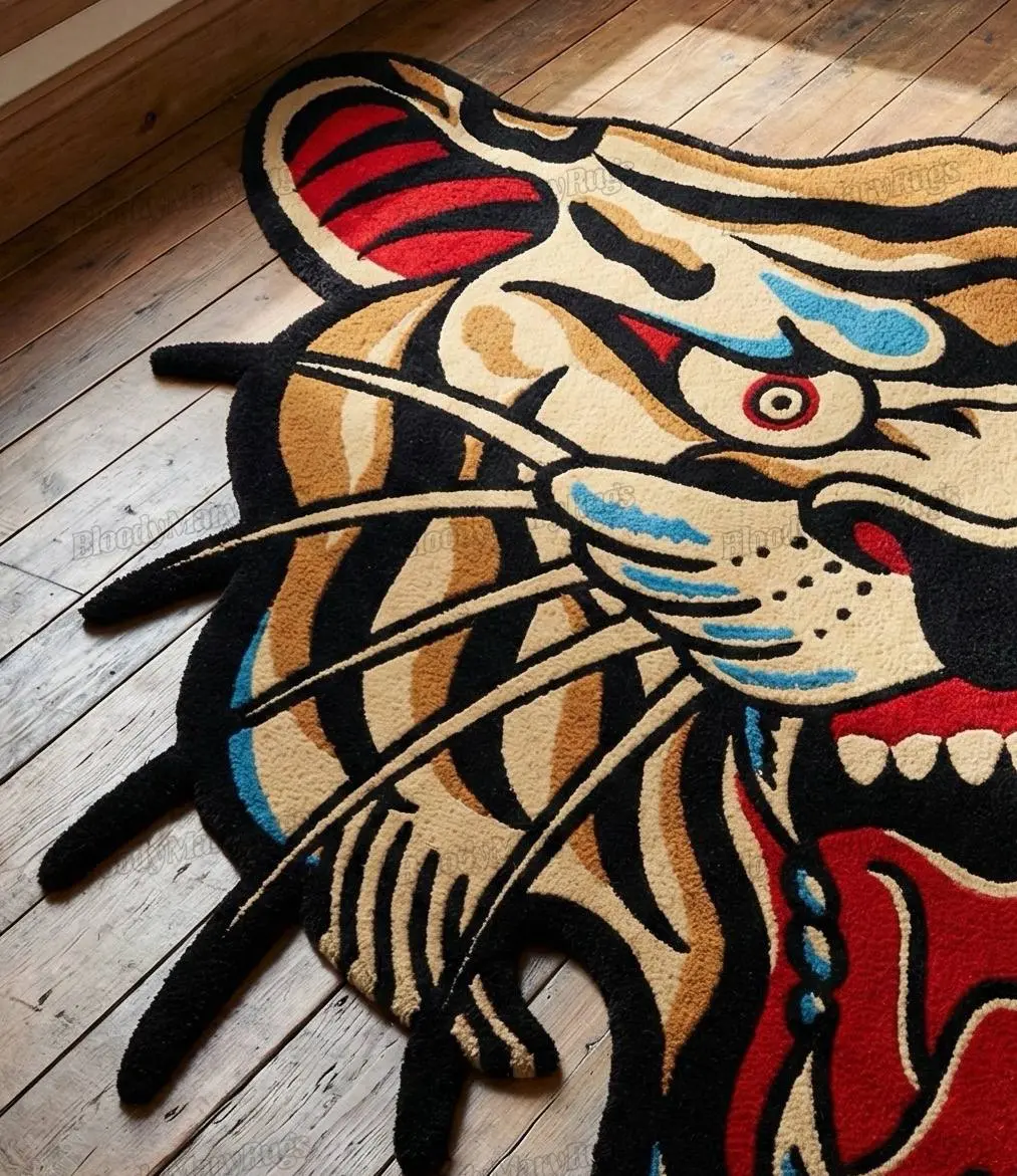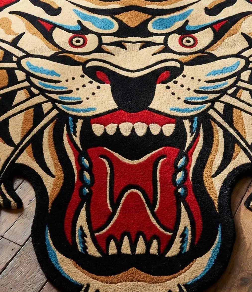 The Roaring Tiger Tattoo Rug from BloodyMaryRugs® looks like a flash sheet leaped off the wall and landed in the middle of your floor mid‑roar. The hand‑tufted pile traces every stripe, whisker, and fang, so the tiger doesn’t just sit there; it feels like it’s guarding the room.