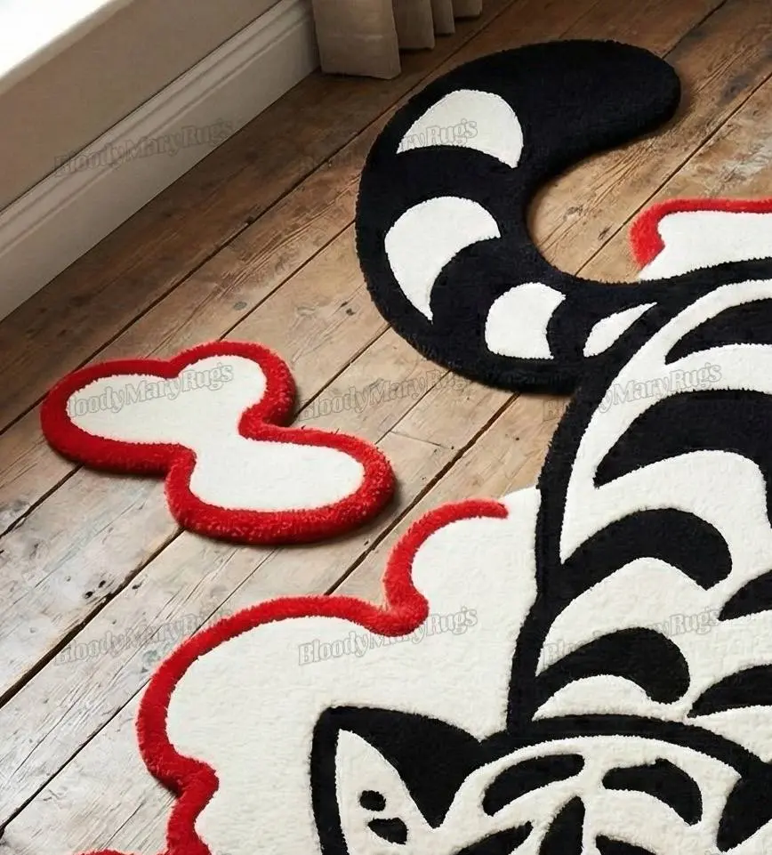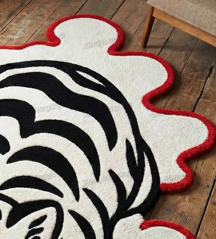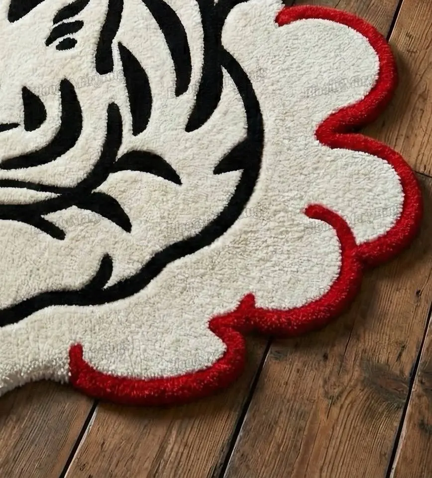 This hand tufted White Tiger Cloud rug from BloodyMaryRugs® looks like a piece of tattoo flash art decided to take a nap on your floor. The sleeping tiger, all soft curves and bold black stripes, is nestled into a cloud of cream wool edged in bright red, with a little separate puff at the tail that makes the whole scene feel like it’s drifting through your room.