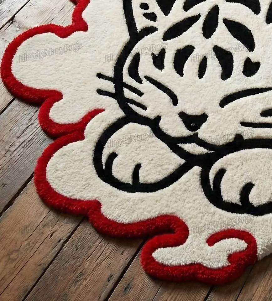 The custom silhouette follows every curve of the cloud and tiger, so there’s no harsh rectangle, just a smooth, organic shape that softens the lines of your furniture. The contrast of white, black and red is clean and graphic, popping beautifully against wooden floors and instantly making the space feel intentional and high‑end – like a boutique hotel or cool Tokyo apartment, without the hotel price tag.